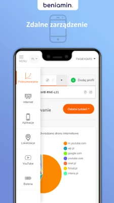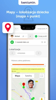A beniamin.pl weboldalon keresztül távolról, bármely helyről irányíthatja a gyermekek online tevékenységét. Képessé válik bizonyos alkalmazások blokkolására, új alkalmazások letöltésének megakadályozására, valamint rugalmas időbeosztások létrehozására. Jutalomként extra képernyőidőt is adhat jó magaviseletért vagy tanulmányi eredményekért, motiválva ezzel a felelős médiahasználatot. A nyugalom érdekében az Aplikacja Beniamin precíz helymeghatározó funkcióval is rendelkezik, amely lehetővé teszi, hogy bármikor ellenőrizze gyermeke aktuális tartózkodási helyét és korábbi útvonalait, teljes átláthatóságot biztosítva.