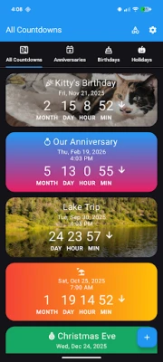 Az Esemény visszaszámlálások testreszabható dátumkövetőket kínál telefonokra, tabletekre és Wear OS órákra. Hozz létre egyedi visszaszámlálókat bármilyen eseményhez, személyre szabható háttérrel, ikonokkal és színekkel. Rendezze kategóriákba, szinkronizálja eszközei között, és élvezze a reklámmentes élményt.