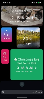 Tegye igazán sajátjává a számlálóit a széleskörű testreszabási lehetőségekkel! Válasszon egyedi háttereket, ikonokat és szövegszíneket, hogy minden visszaszámláló tükrözze az esemény hangulatát és az Ön személyiségét. A rendezettség kedvéért kategorizálja eseményeit, így könnyedén átláthatja az összes fontos dátumot. A szinkronizált élmény érdekében az alkalmazás zökkenőmentesen működik telefonján, tabletjén és még a Wear OS okosóráján is, biztosítva, hogy mindenhol hozzáférjen a frissített információkhoz és az események állapotához.